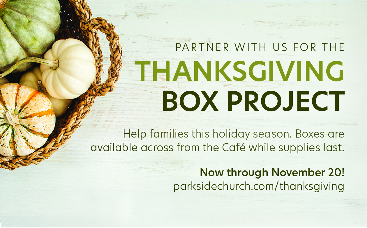 Help cover the cost of the turkey given to each family with their dinner box. Make your check payable to Parkside Church, with “Box Project” on the memo line, or give online and designate “Thanksgiving/Christmas Benevolence."